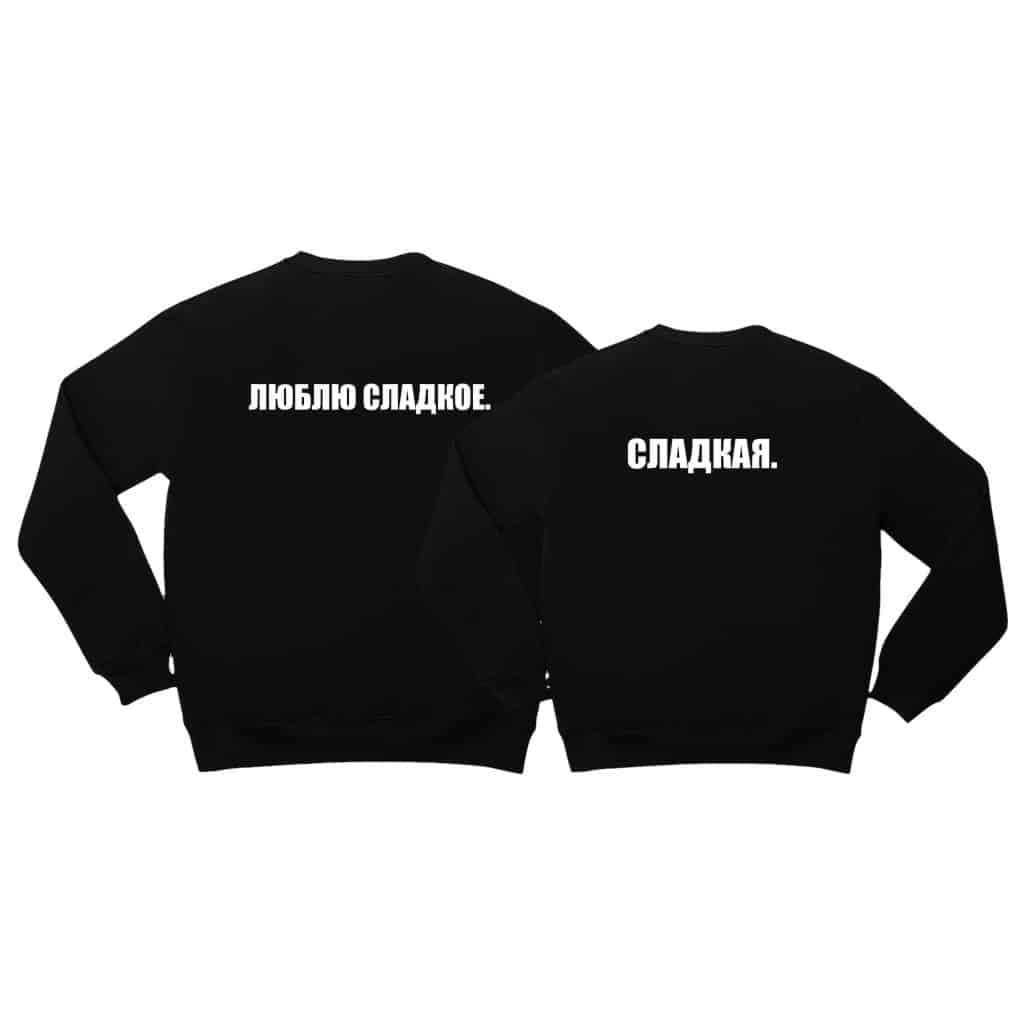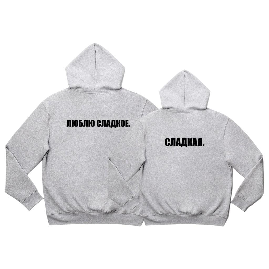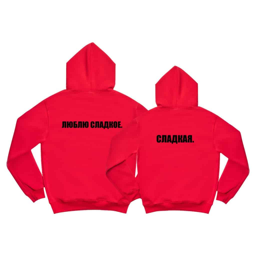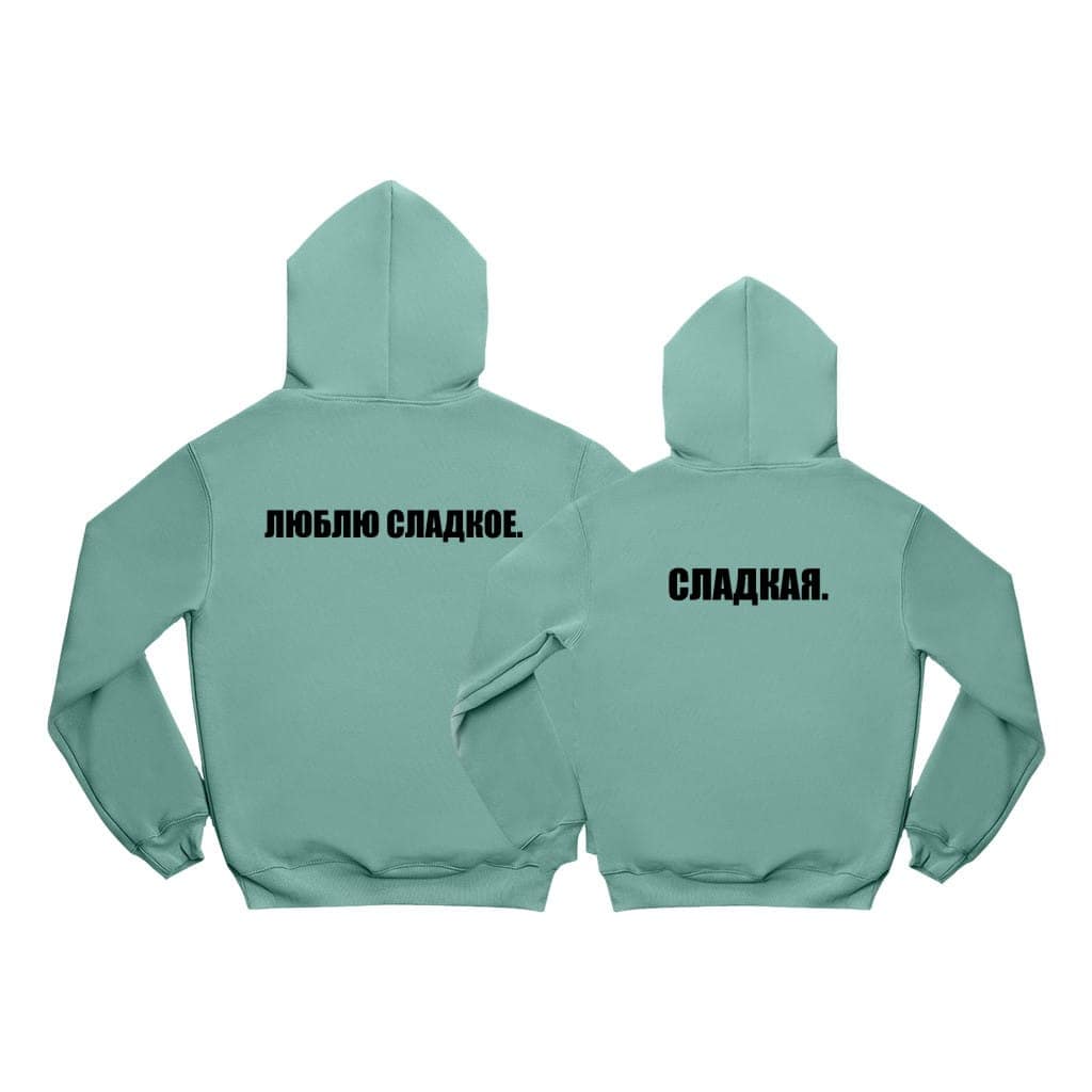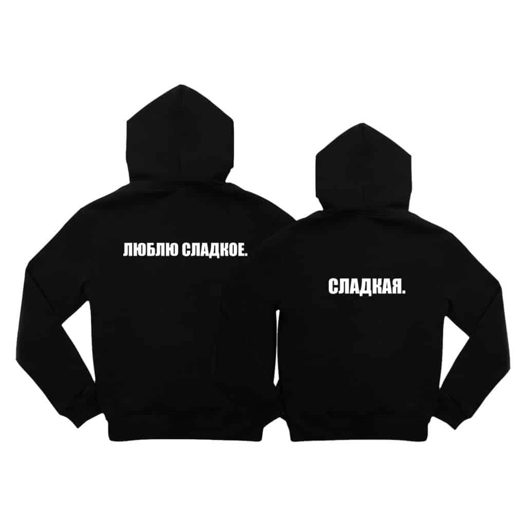 Textul „ЛЮБЛЮ СЛАДКОЕ” adaugă o notă de dulcețe și romantism setului de hanorace personalizate.