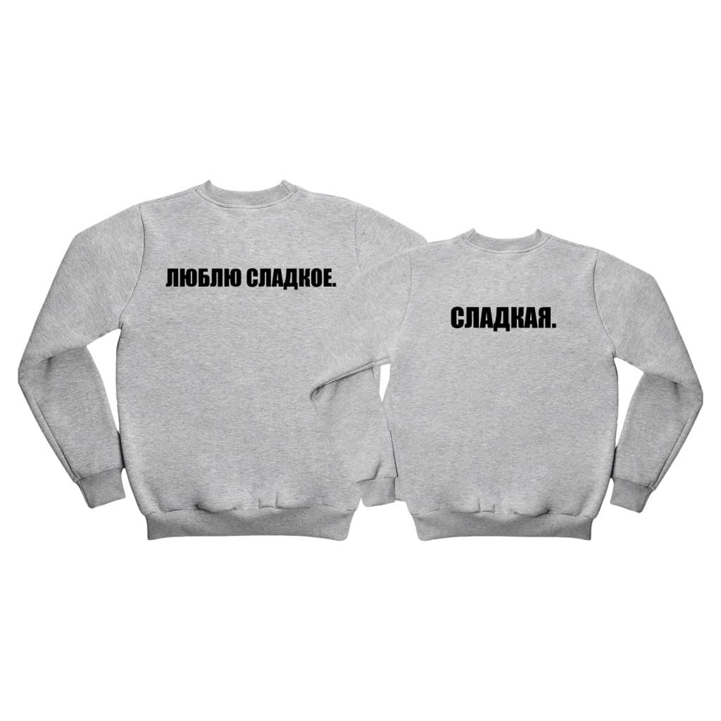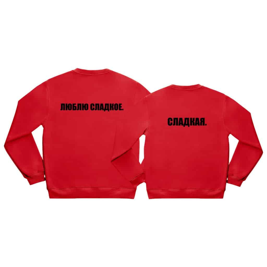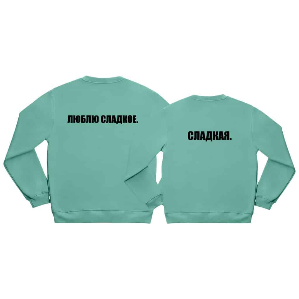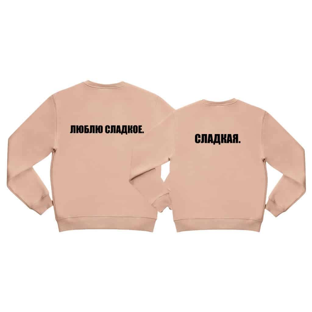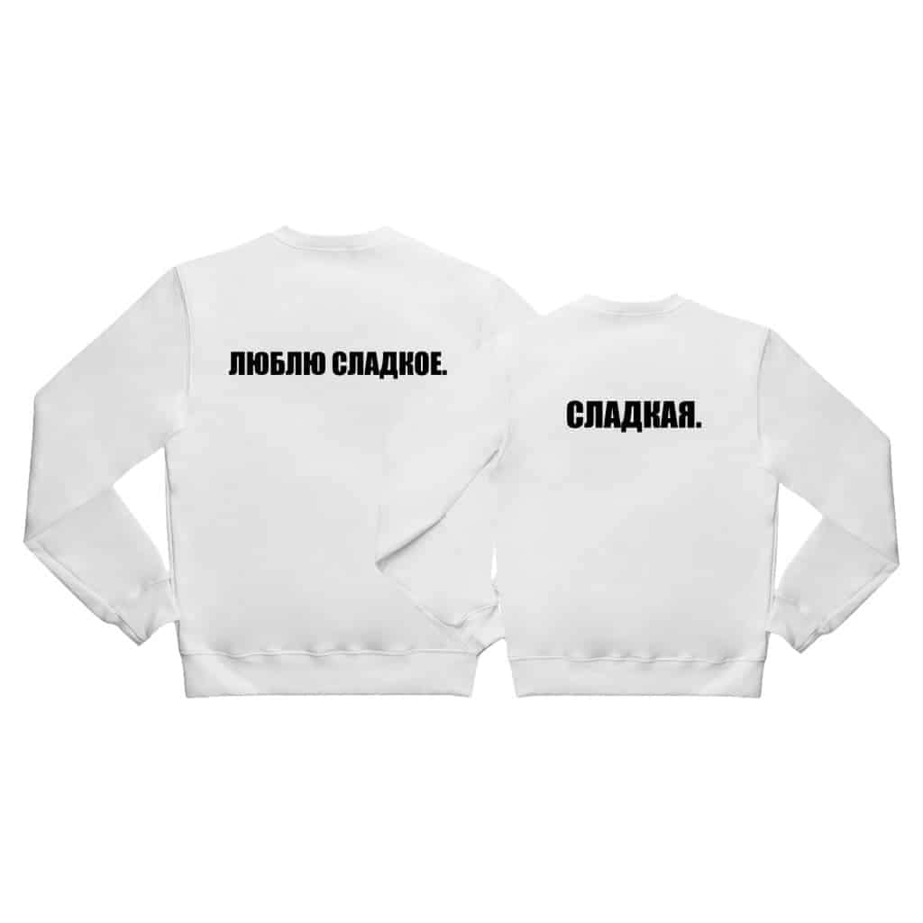 Textul „ЛЮБЛЮ СЛАДКОЕ” adaugă o notă de dulcețe și romantism setului de hanorace personalizate.