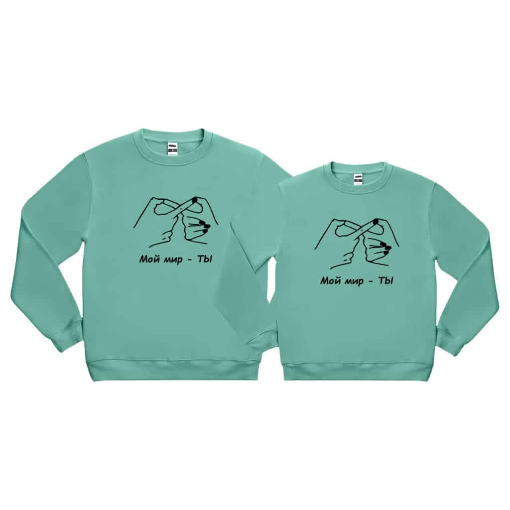 Descoperă setul nostru de hanorace personalizate pentru cuplu, cu mesajul puternic „Мой мир это ТЫ”.