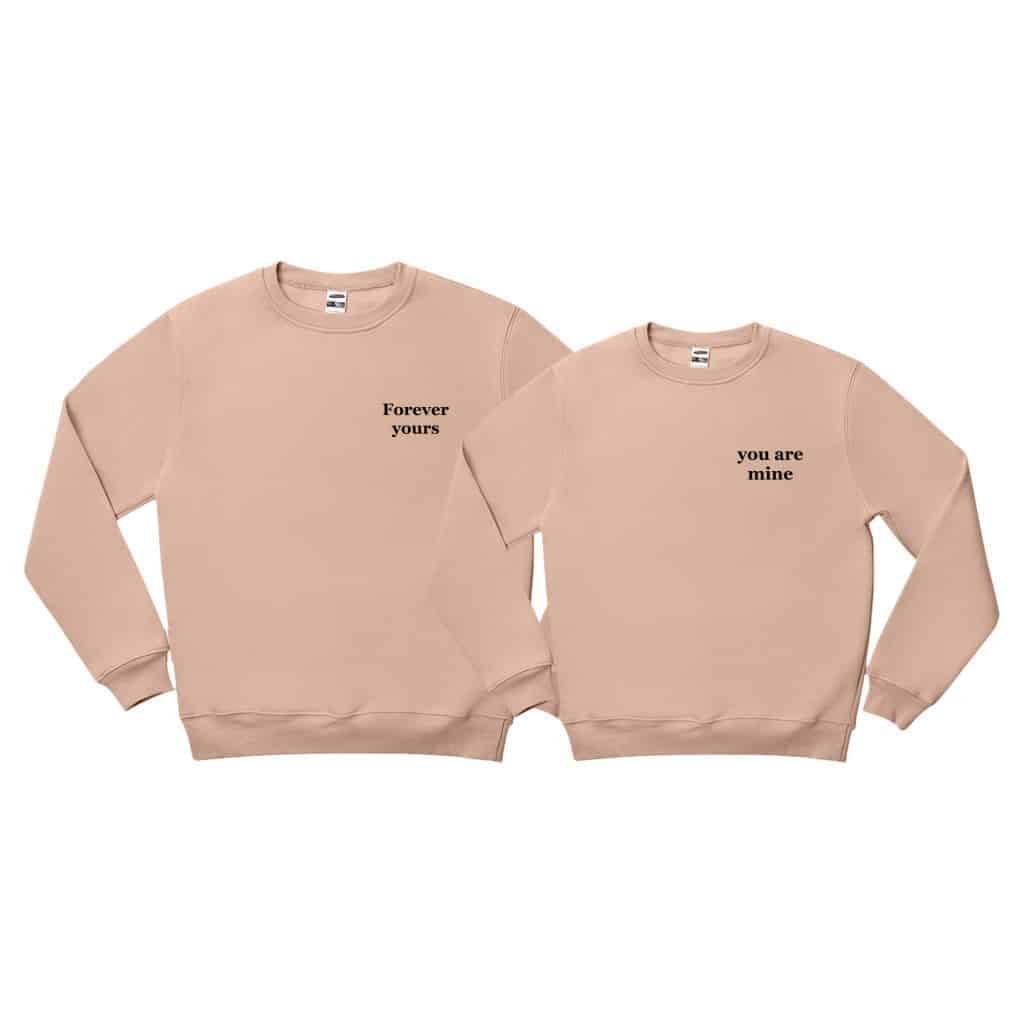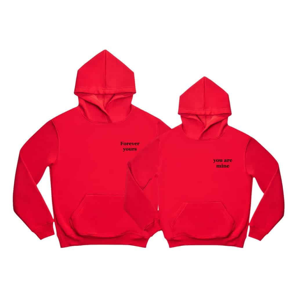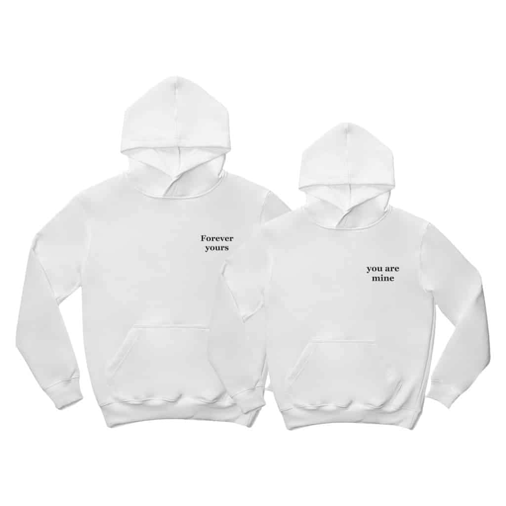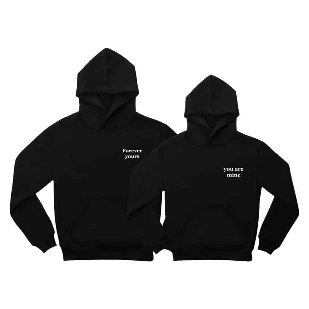 Descoperă setul nostru de hanorace personalizate pentru cuplu, cu mesajul adorabil „Forever yours”.