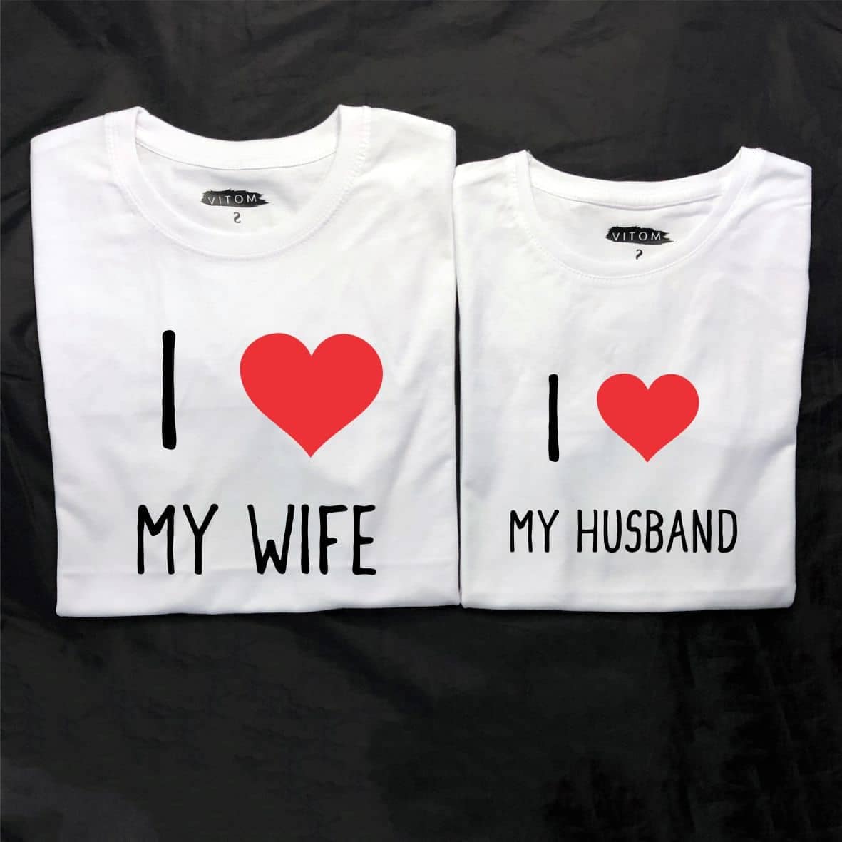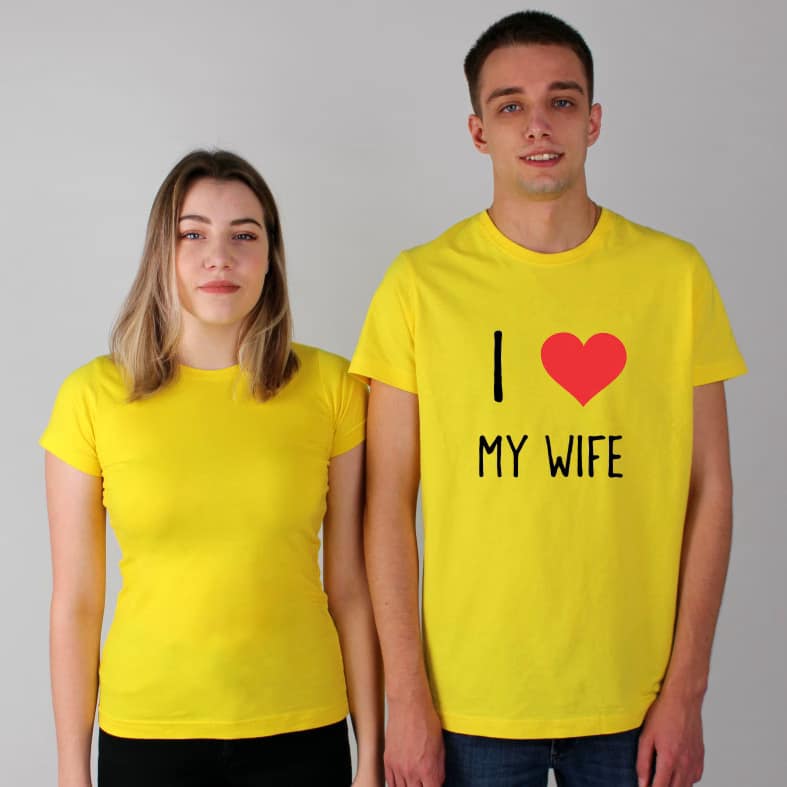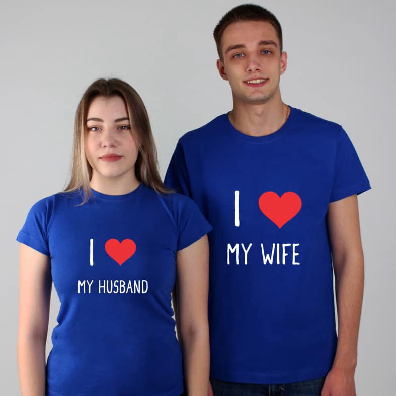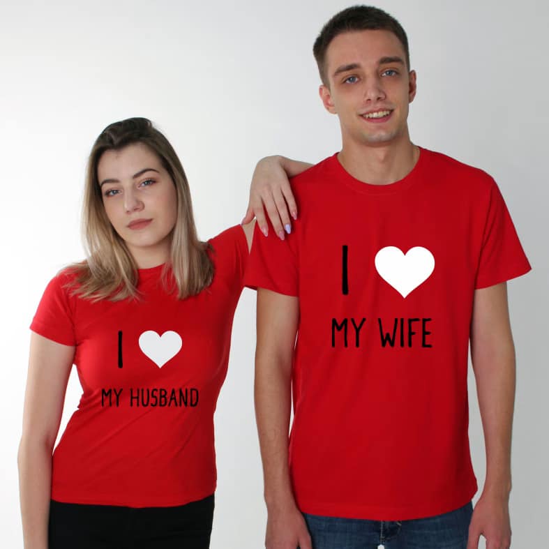 Set tricouri pentru cuplu – I love, personalizate pe față, prin metoda transferului termic.