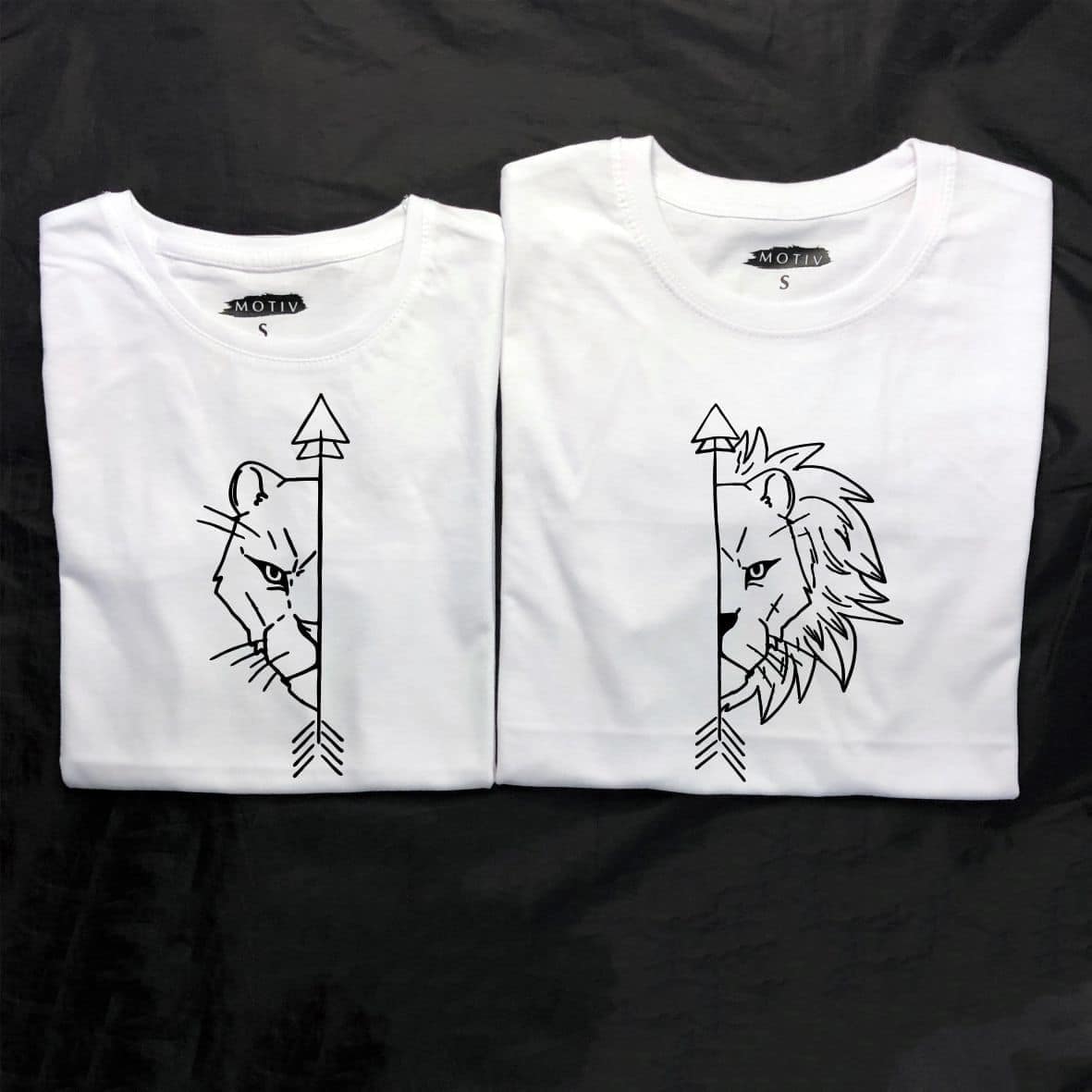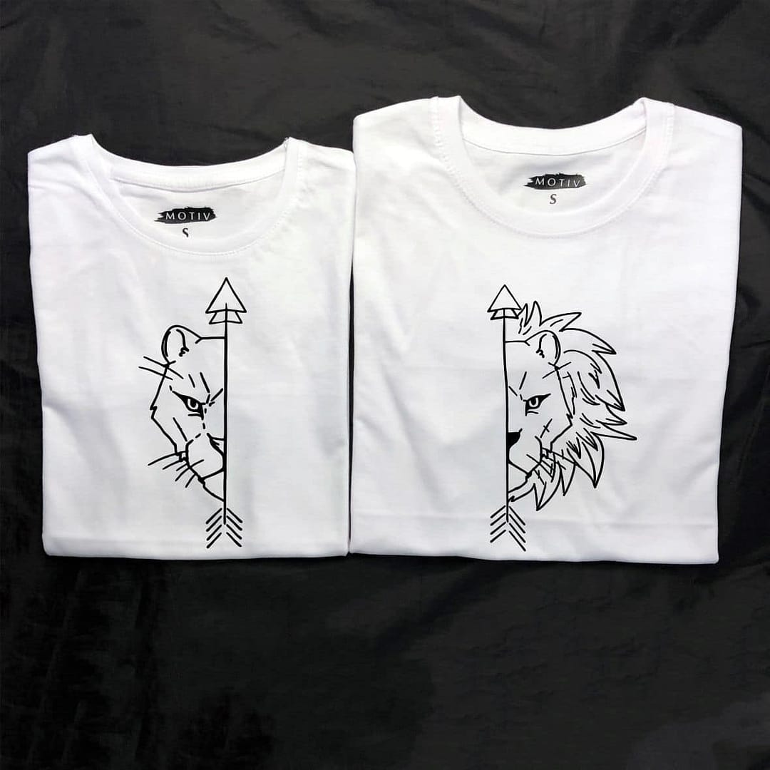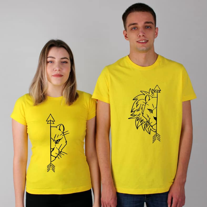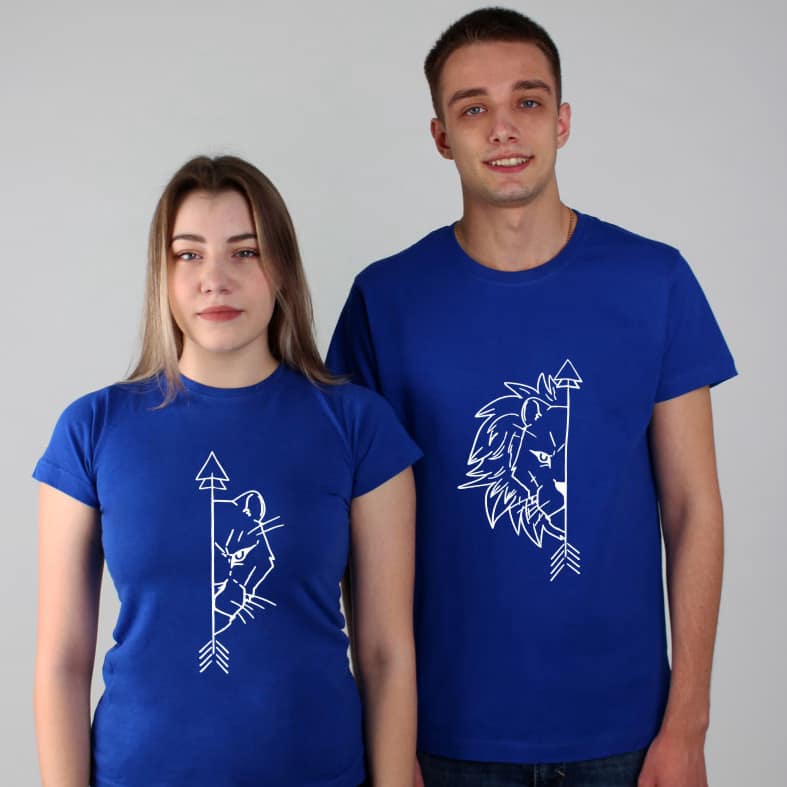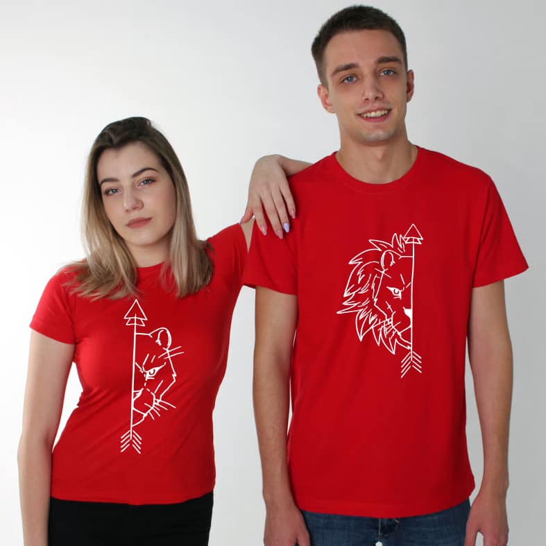 Tricouri pentru cupluri – Lion & Lioness, personalizate pe față, prin metoda transferului termic.